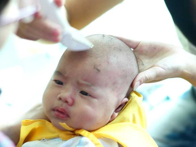 2) 剃发后要洗发,清理干净头皮和碎发。此时洗发特别需要注意,不能把头发弄到宝宝眼睛中,最好仰面洗头