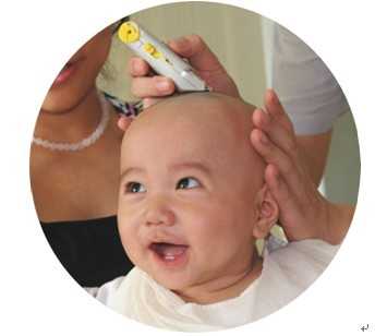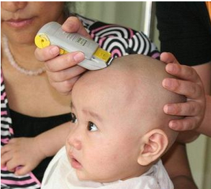 6、对于发丝较硬的宝宝,推子要离宝宝的头皮近一些;对于发丝较软的宝宝,推子要离得相对远一些。总之,不能划到宝宝的头皮。