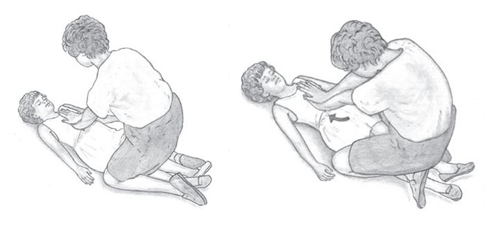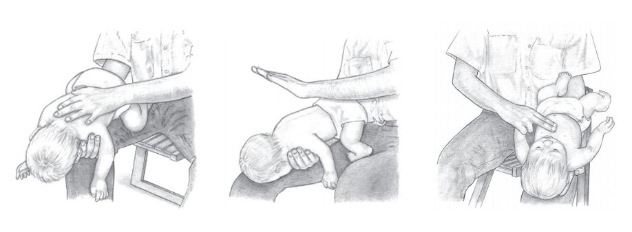 施救者坐在椅子上,将婴儿脸朝地面放在大腿上,一手牢牢的握住婴儿下颏以支持其头颈部,用另一只手的掌跟部用力拍击婴儿两肩胛骨之间的背部4次。